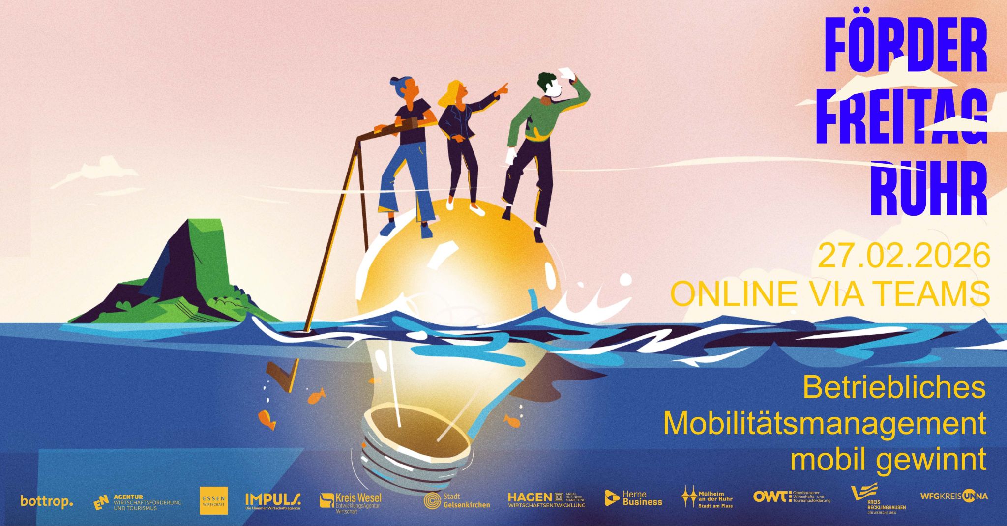 Antworten liefert die nächste Ausgabe des Förder-Freitag Ruhr am Freitag, 27. Februar 2026 um 13:00 Uhr. Im Fokus steht das Thema betriebliches Mobilitätsmanagement sowie das Landesprogramm „mobil gewinnt“.
